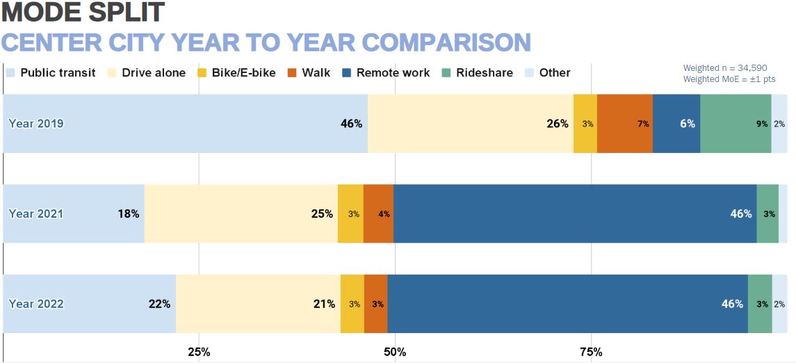 More than any time this century, how you commute to and through Seattle reveals much about your salary, what type of job you work, whether you have dependents, and what type of home you live in. Our 2022 Seattle Commute Survey (formerly “Center City Mode Split Survey”) is a snapshot of how people get to the places they need to go as we continue to emerge from the pandemic.
