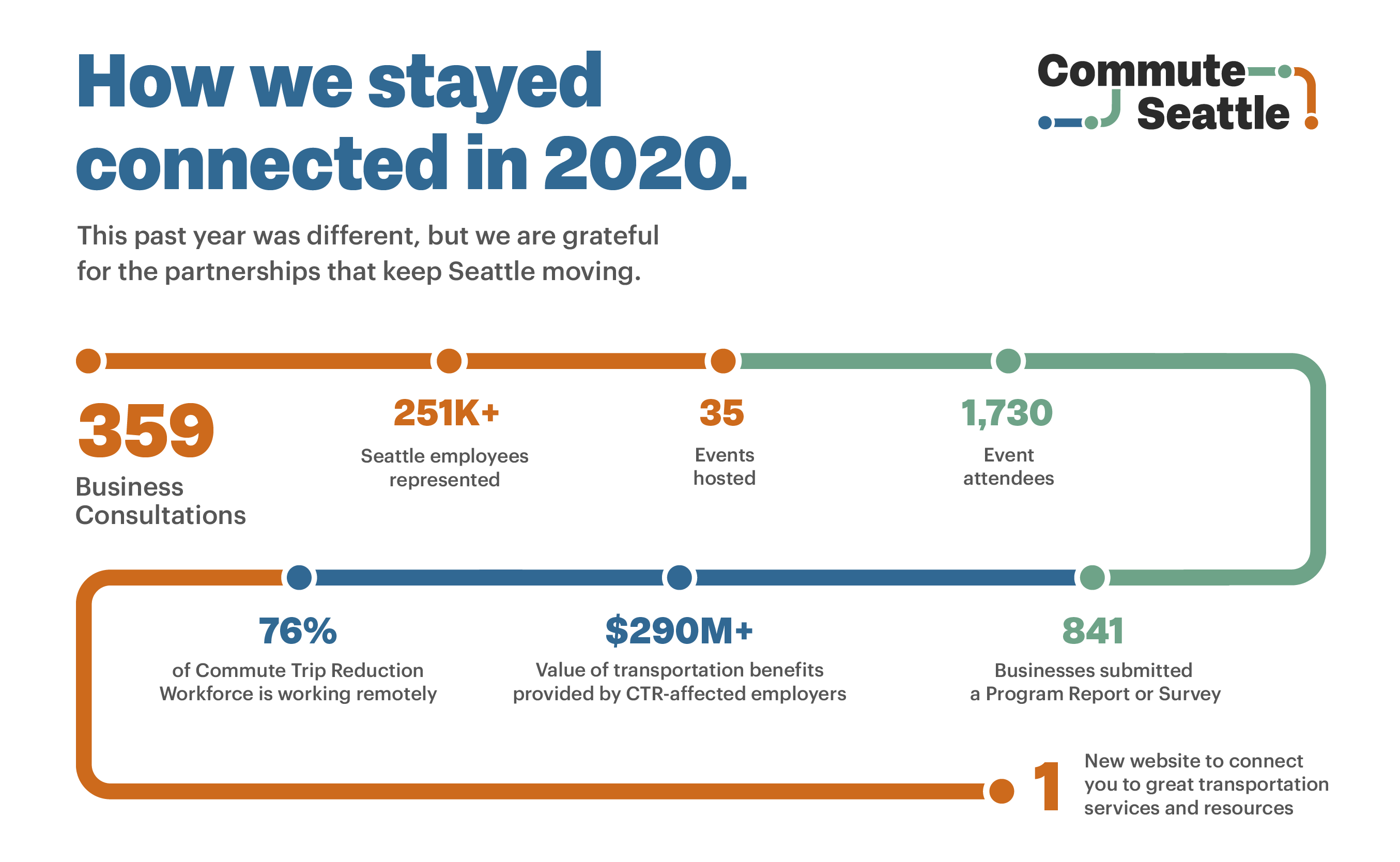 Like so many of you, our work at Commute Seattle took a sharp, virtual turn in 2020. And we are glad that you were right there with us, learning and adapting together as we made our way through an uncertain year.